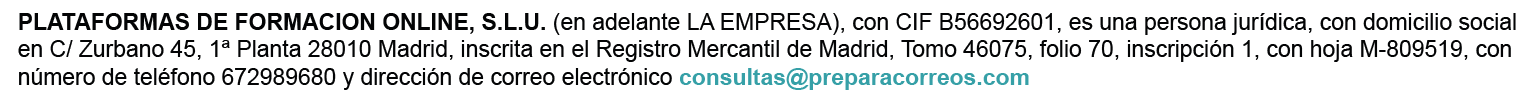 3) La información precontractual sobre los cursos impartidos, precios y modalidades de pago, así como la información contractual está a disposición del público en la propia página web preparacorreos.com y en sus avisos legales. Para cualquier duda o aclaración puede dirigirse a consultas@preparacorreos.com.