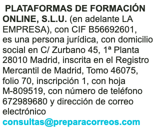 3) La información precontractual sobre los cursos impartidos, precios y modalidades de pago, así como la información contractual está a disposición del público en la propia página web preparacorreos.com y en sus avisos legales. Para cualquier duda o aclaración puede dirigirse a consultas@preparacorreos.com.