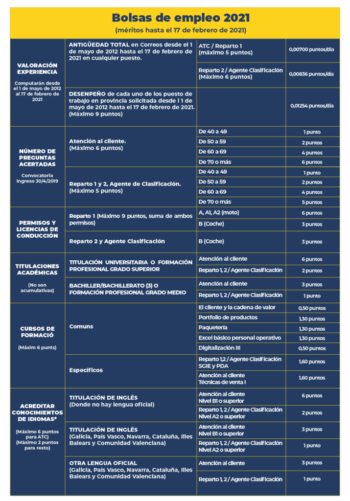 Para que puedas hacerte una idea previa de los puntos extra y los méritos que podrás tener para acceder a la Bolsa de Empleo de Correos, te mostramos este cuadro que ha publicado la propia compañía para la convocatoria del pasado mes de febrero.