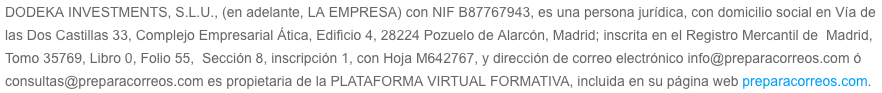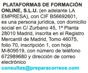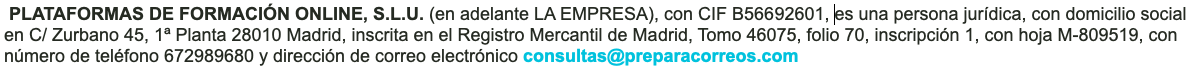 LA EMPRESA proporciona servicios de formación no reglada. Por lo tanto, las enseñanzas impartidas por su PLATAFORMA VIRTUAL FORMATIVA no conducen a la obtención de un título con valor oficial. Esta formación tiene como objetivo la preparación de oposiciones con categoría profesional de personal laboral fijo en la SOCIEDAD ANÓNIMA ESTATAL CORREOS Y TELÉGRAFOS, S.A. SME.